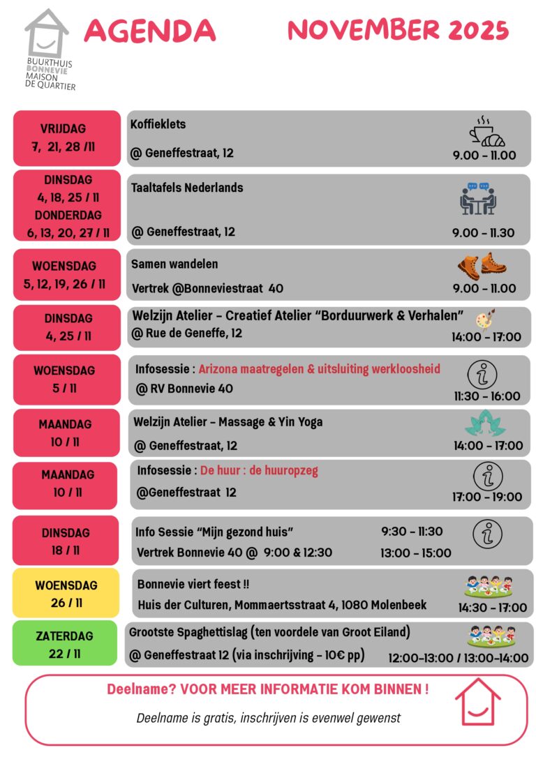 We nodigen je uit om onze maandelijkse agenda te volgen op onze website, onze Facebookpagina of rechtstreeks bij het onthaal van het Buurthuis Bonnevie.